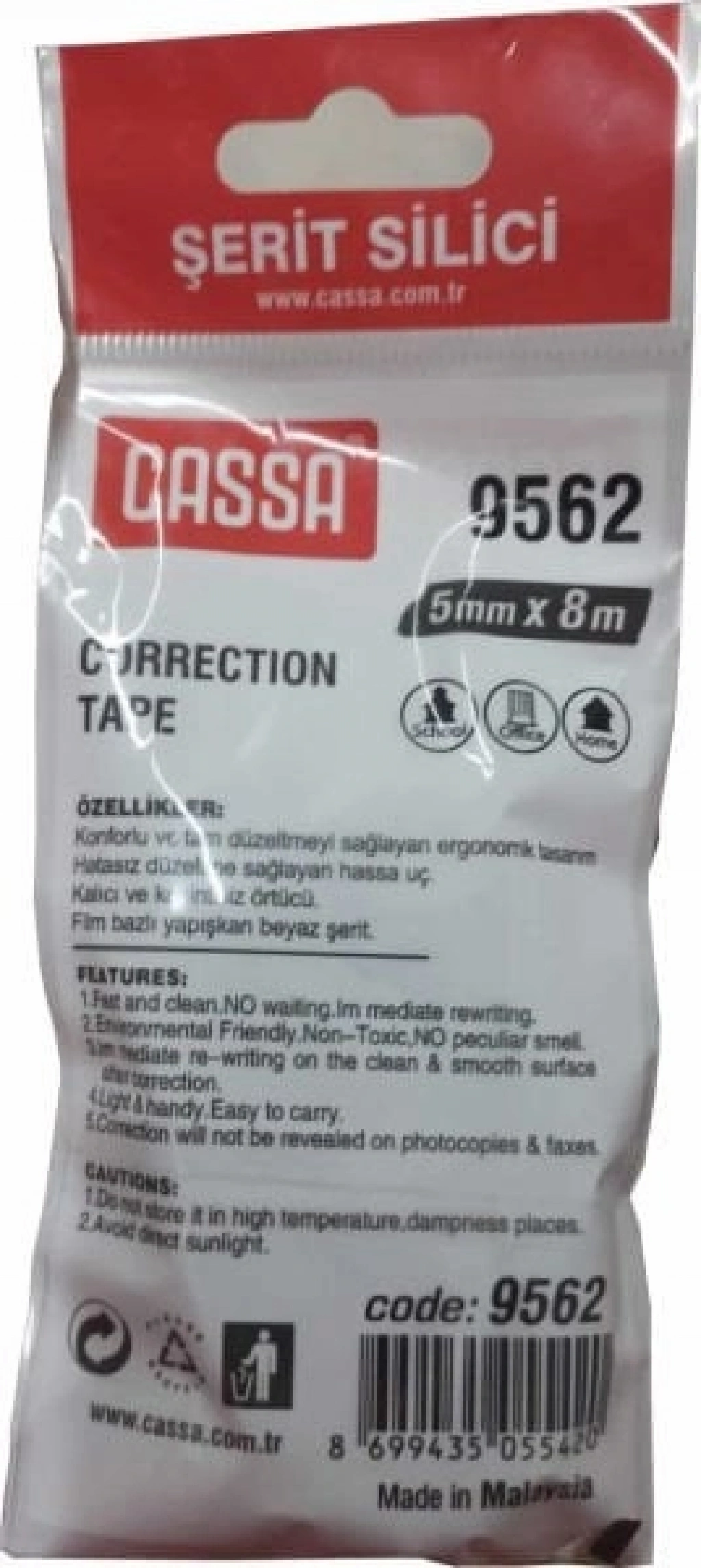 Cassa 9562 5 mm x 8 m Şerit Silici, sıvı daksillere göre çok daha hızlı, temiz ve pratik kullanımıyla ön plana çıkan bir ürün. 5 mm genişlik ve 8 m şerit uzunluğuna sahip bu ürün, dayanıklı plastik kasaya sahiptir. Her iki el kullanımına uygun tasarımdaki gövdesi, ergonomik formdadır. Kopmayan taşıyıcı bant üzerinden kâğıda aktarılan bu kuru nitelikteki düzeltici sayesinde çok daha düzgün hatlara sahip düzeltmeler yapmanız mümkündür. Sıvı daksillerde yaşadığınız kurumasını bekleme, taşma-dağılma gibi olumsuz özelliklerle karşılaşmazsınız. Üzerine hemen yazı yazabileceğiniz yüksek kapatıcılığa sahip bu ürün, hemen her türde kâğıda kolayca yapışır. Kopma, dağılma, parçalanma gibi kötü sonuçlar doğurmaz. En iyi düzeltme sonuçları için 50-60°’lik bir açıyla bastırın ve yavaşça çekin. Faks-fotokopide gözükmeyen özelliğe sahip bu şerit düzeltici, sağlığa zararlı asit ve ağartıcılar içermez. Ev, okul, ofis ve kurumlar için oldukça kullanışlı olan bu ürün, blister ambalajında satışa sunulur. Tüm bu özelliklerinin yanında Cassa 9562 5 mm x 8 m Şerit Silici, fiyatı ve kalitesiyle de ön plana çıkıyor.