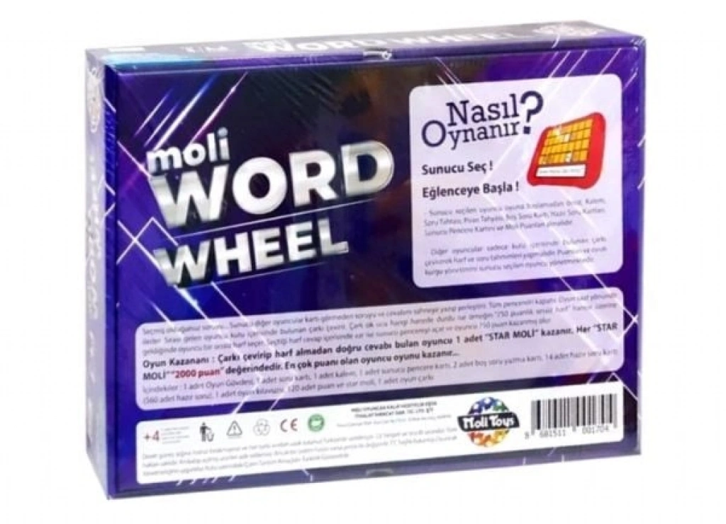 Moli Word Wheel Çarkıfelek, çocuklarınız, arkadaşlarınız veya ailenizle beraber hoşça vakit geçirip eğlenceli anılar biriktirebileceğiniz oldukça ekonomik bir kutu oyunudur. Pahalı kutu oyunlarına ideal bir alternatif oluşturan bu ürün, sizlere 37x26x6 cm karton kutu içerisinde satışa sunulur ve oyun 1 adet oyun gövdesi, 1 adet soru kartı, 1 adet kalem, 1 adet sunucu pencere kartı, 2 adet boş soru yazma kartı, 14 adet hazır soru kartı, 1 adet oyun kılavuzu, 120 adet puan ve star moli, 1 adet oyun çarkından oluşur. Toplamda 560 adet soru içeren bu aile oyunu, 8 yaş ve üzeri için kullanıma uygundur. 2-4 kişiye kadar oynanabilen bu oyunda çarkı çevirip bir harf seçin ve puanları kazanmaya başlayın. Oyunun nasıl oynanacağına dair yönergeler kutu içerisinde mevcuttur. Karne hediyesi ya da doğum günü hediyesi olarak tercih edilebilir nitelikteki bu oyun, çocuklarınız ya da arkadaşlarınızla güzel vakitler geçirmenize olanak tanır. Dikkat gelişimi, sözel ve görsel hafızayı güçlendiren bu aile oyunu, çocukların sosyal gelişimini destekler ve özgüvenlerinin artmasına yardımcı olur. Tüm bu özelliklerinin yanında Moli Word Wheel Çarkıfelek, ekonomik fiyatı ve sağlık dostu içeriğiyle de ön plana çıkıyor.